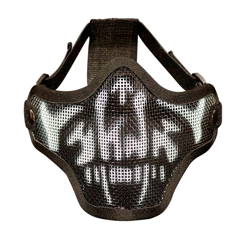 FJA -120 Máscara meia face de proteção com tela em fio de aço de alta qualidade, acessório para pratica esportiva feito para proteger a região do nariz, bochechas, boca e queixo, com acabamento em viés de 50%algodão, 50%pet proporcionando encaixe confortável a face, malha respirável, permitindo que o ar flua através dos nichos da tela, sua fixação se dá por meio de cinta flexível: duas nas laterais e uma central na parte de trás, ajustável por fivelas.